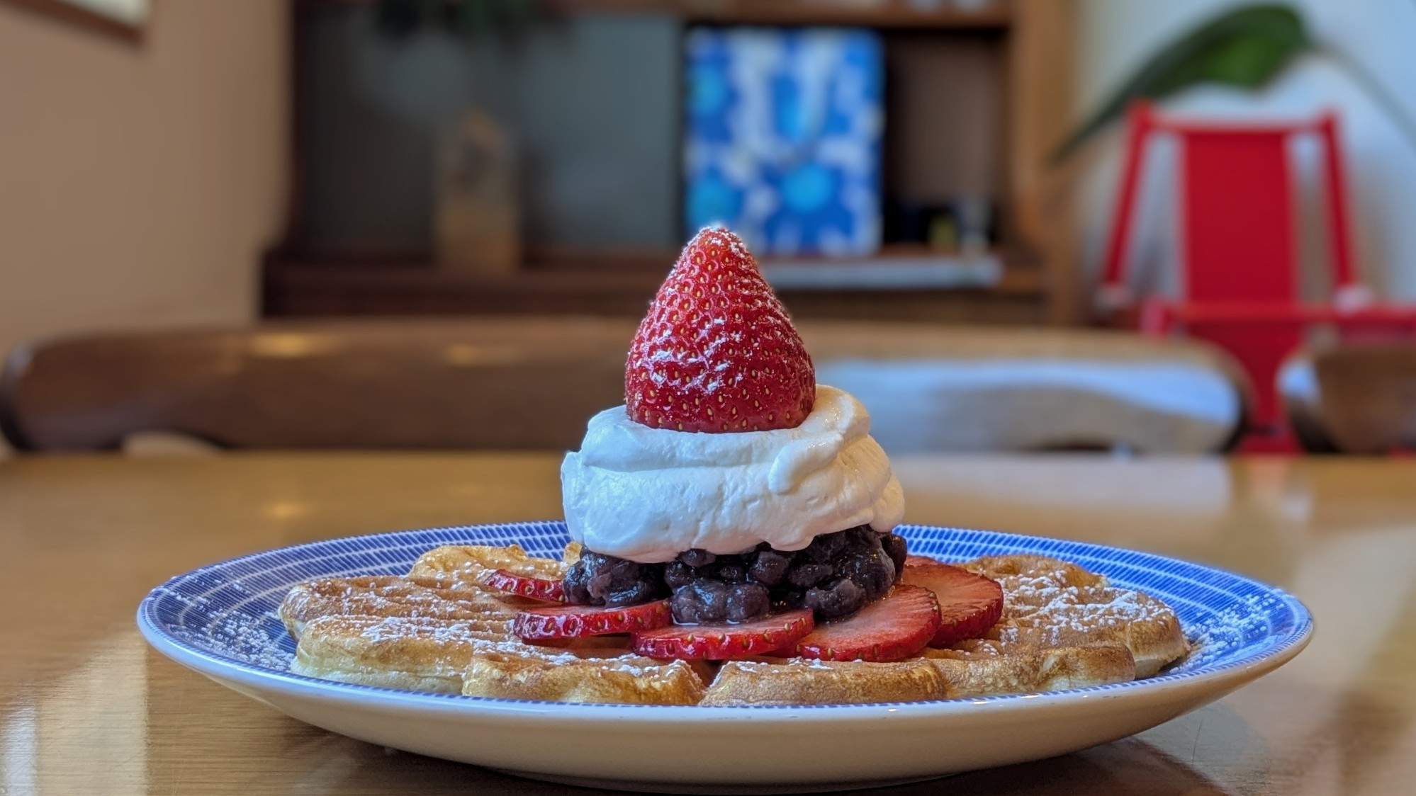 もっちり柔らかな北欧ワッフルに、スライスしたいちご、ふっくら香りよく仕上げた自家製あんこ、注文毎にたてるホイップを重ね、1番上にまるごと1個のいちごをのせました。